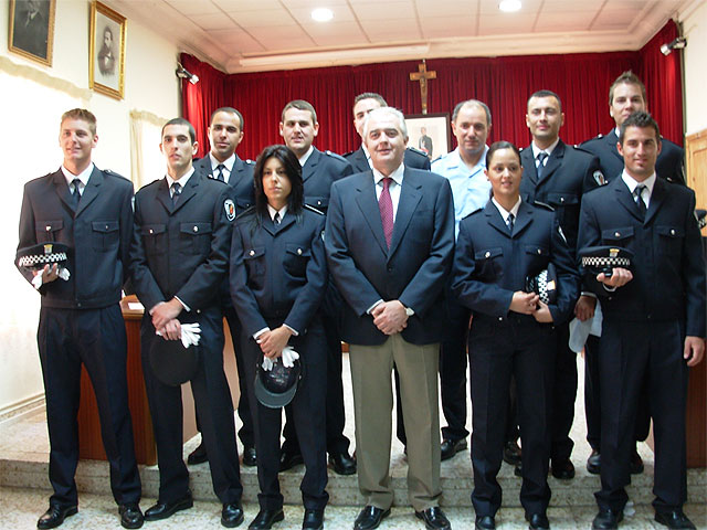 Esta mañana los diez nuevos agentes de la Policía Local han tomado posesión del cargo como miembros de la Policía Local del municipio de Abarán ante la Constitución Española. Familiares y amigos han acompañado a estos nuevos miembros del Cuerpo que fueron presentados oficialmente el pasado 19 de marzo en un acto celebrado con motivo del Día del Patrón de la Policía Local, San José, en la Ermita de los Santos Médicos San Cosme y San Damián. El juramento ha estado presidido por el alcalde de Abarán, Antonio Eugenio Gómez, y ha contado con la presencia del Sargento Jefe de la Policía Local, Serafín García, el concejal de Juventud, Desarrollo Local y Empleo, José Luis Tornero Carpena, el concejal de Nuevas Tecnologías, José G. Cano Montoro y la concejal de Mujer, Fiestas, Familia y Menor, Isabel Carrasco.
