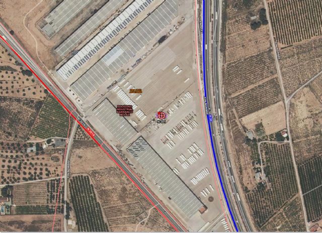 Servicios de emergencia sofocan incendio de industria, de semirremolques frigoríficos, en la N-301 al lado de automóviles Merino en el término municipal de Abarán.